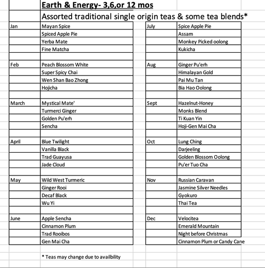 Earth & Energy: traditional single origin teas with a few caffeine free blends.