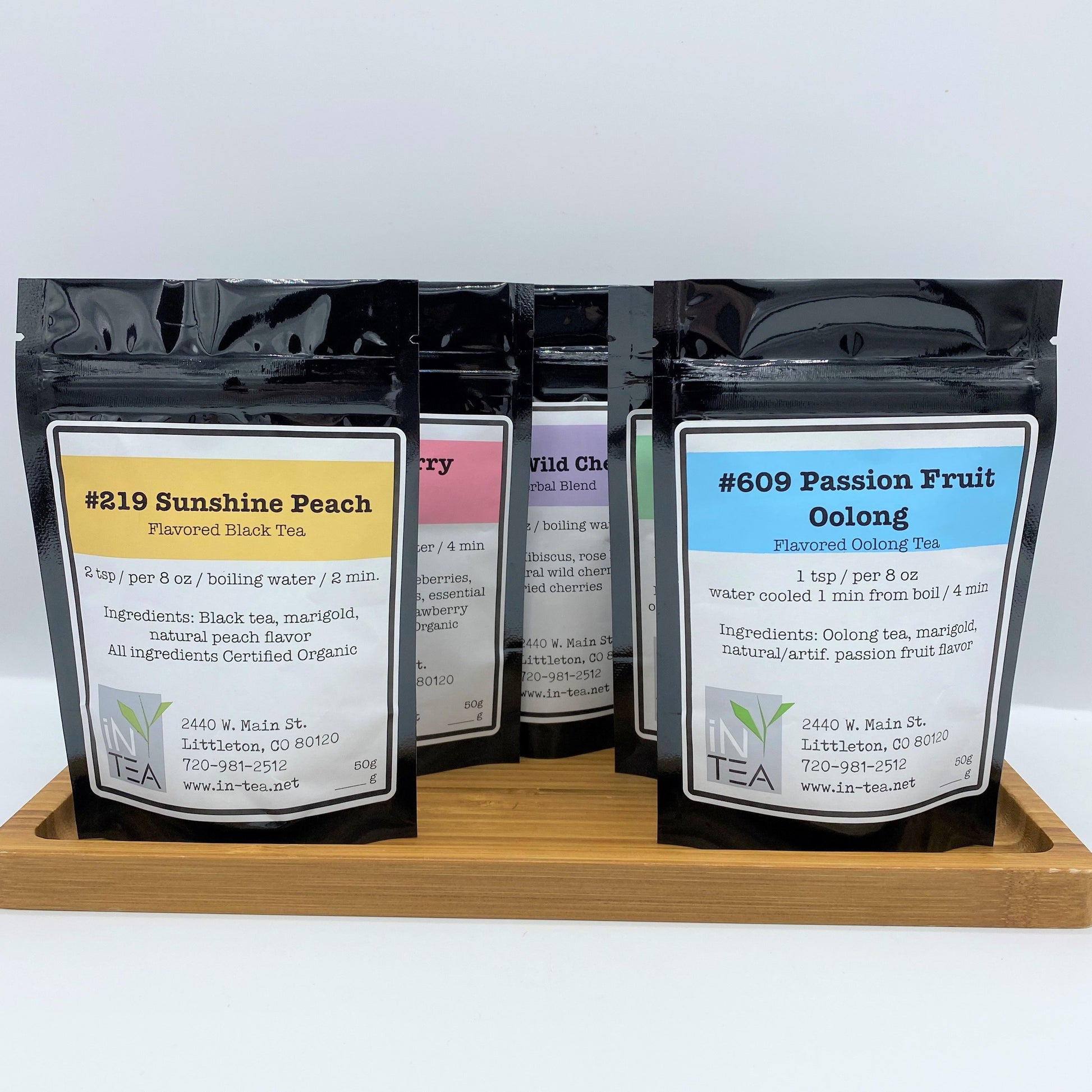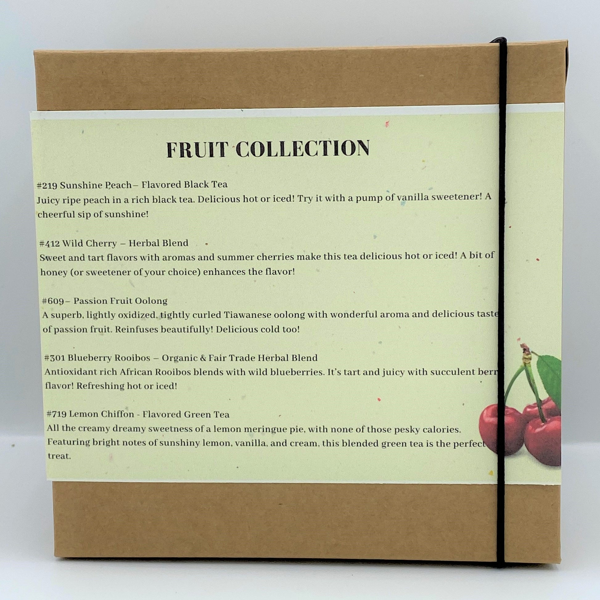 Includes 4 servings of each of the following tea: Sunshine Peach Black, Wild Cherry Herbal, Passion Fruit Oolong, Blueberry Rooibos, and Champagne Raspberry White.