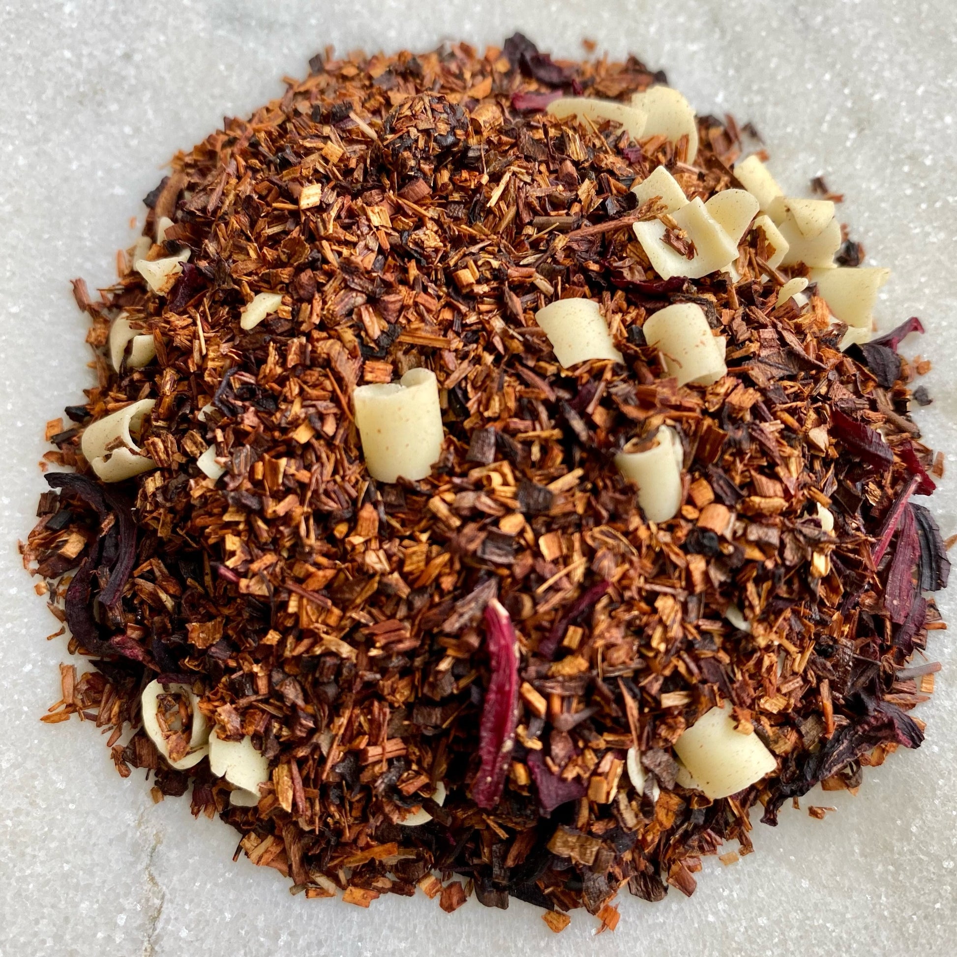 Ingredients: Certified Organic Rooibos, Organic Honeybush, Organic Black Currants, Organic Hibiscus, and White Chocolate